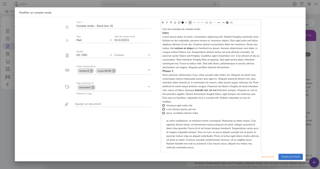 Vous pouvez rédiger des comptes rendus et les lier à des sociétés fournisseurs, collaborateurs pour permettre une meilleure circulation des informations au sein de vos équipes.