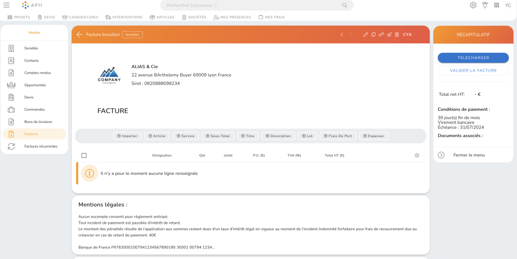 Vous pouvez modifier les mentions légales en cliquant directement sur l’encart en bas de la facture.