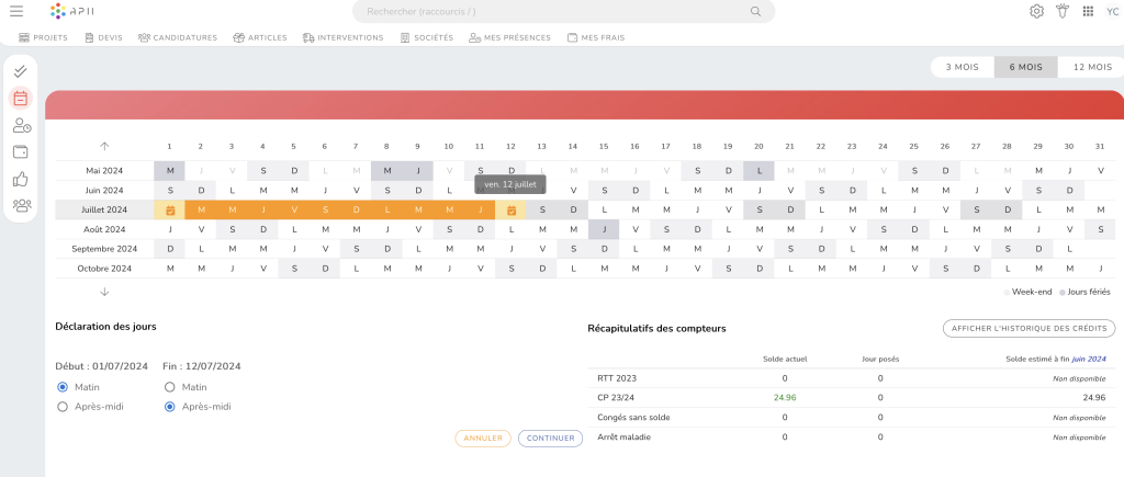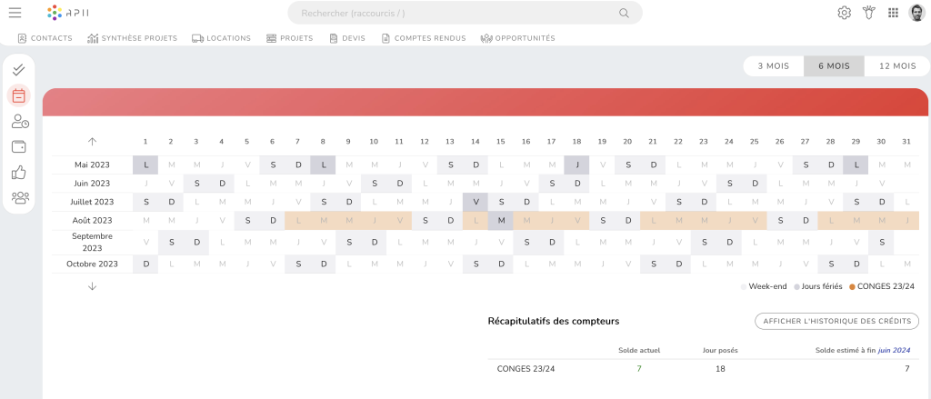 Vous pouvez rapidement consulter vos périodes de congés sur une période de 3, 6 ou 12 mois. Apii permet la création de compteur pour chaque congé (Congé, RTT, etc) et vous pouvez également consulter votre solde restant.